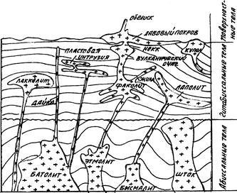 Эндогенные процессы, охватывающие тектоносферу, часто именуются тектоническими. Тектонические процессы связаны с внутренней активностью Земли. Их движущей силой является огненно-жидкий расплав - магма. Этот поток материи и тепла, периодически устремляющийся к поверхности из недр планеты, обеспечивает геологический процесс, называемый магматизмом. В результате застывания магмы на глубине (интрузивный магматизм) возникают интрузивные тела - батолиты, штоки, пластовые интрузии, дайки и т.д. Застывшая на поверхности Земли магма образует лавовые потоки и покровы. Это эффузивный тип магматизма. Современный эффузивный магматизм именуют вулканизмом (рис. III.5).