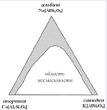 Системы с изоморфными замещениями могут быть и более чем двухкомпонентными. В случае таких систем речь уже идет не о рядах, а о полях и целых областях изоморфной смесимости, как это характерно, например, для полевых шпатов (рис. 2) при высоких температурах, когда смешению подвергаются плагиоклазы и калиевые полевые шпаты.