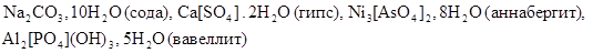 Связанная вода в кристаллической структуре участвует в виде молекул Н2О, занимающих в ней строго определенные места. Количество молекул воды находится в простых отношениях к другим компонентам соединения. В качестве примеров можно привести следующие: Na2CO3 . 10H2O (сода), Ca[SО4] . 2H2O (гипс), Ni3[AsO4]2 . 8H2O (аннабергит), Аl2[РО4](ОН)3 . 5Н2О (вавеллит)