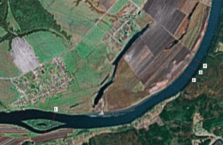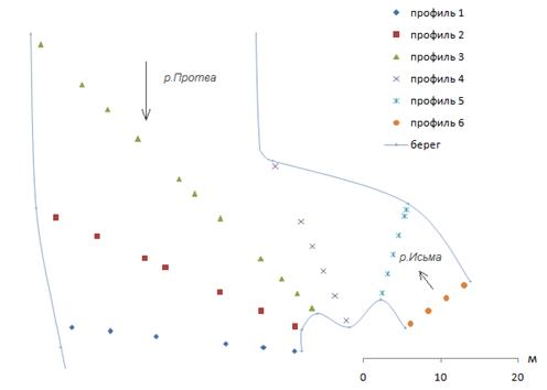 Рис. 4.1. Схема участка р. Ока с расположением створов наблюдений