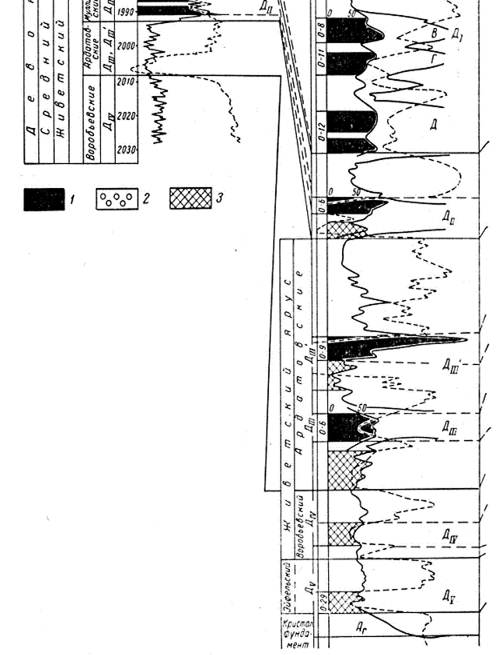 Локальные зоны отсутствия комплекса установлены или предполагаются по геофизическим данным в приподнятых частях Татарско-Коми-Пермяцкой или Токмовско-Сыктывкарской систем сводовых поднятий (Воронье, Ломик, Толошер, Сысола), а также в районе Ксенофонтово. Мощность комплекса изменяется от единиц метров в присводовых зонах древних поднятий до 200 м в Краснокамско-Полазненской зоне и до 1200-1300 м в Казанско-Кажимском авлакогене [83 и др]. В эйфельско-тиманской толще выделяется шесть проницаемых алевролито-песчаных пластов ДV - в основании эйфельского яруса, ДIV - в воробьевских слоях, ДIII-в ардатовских, ДII- в муллинских, ДI - в пашийском горизонте и Д0 - в тиманском. Промышленная нефтеносность и перспективы дальнейших поисков нефти связываются в основном с тиманско-живетской терригенной частью комплекса. Наиболее выдержаны по составу и широко развиты по площади пласты ДIII, ДII и ДI. Лучшими коллекторскими свойствами обладают мелкозернистые отсортированные песчаники, представляющие собой одну из основных литологических разностей в рассматриваемых пластах. Значения открытой пористости составляют 12-23%, проницаемости от единиц до 2000 мд. Мощность алевролито-песчаных пород изменяется от 0 до 80 м в Пермском крае и Удмуртской Республике и до 280-300 м в Кировской области и Марийской Республике (зона Казанско-Кажимского авлакогена)