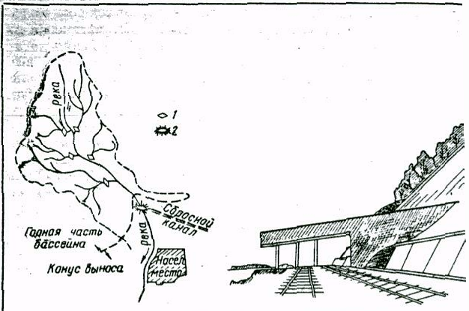 Рис.12 Схема расположения селезащитных сооружений в бассейне реки (1-плотина-запруда; 2-струенаправляющая дамба) и железобетонный селедук для организованного сброса селя над полотном дороги