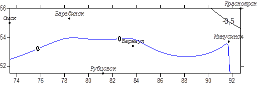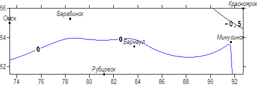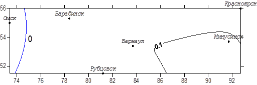 Согласно изолиниям пространственного распределения σГТК (рисунки 13-15) можно сделать предположение, что вся исследуемая территория юга Западной Сибири является зоной большой изменчивости данной величины за весь вегетационный период. Следовательно исходя из средних значений ГТК, на этой территории тепловлагообеспеченность по ГТК может быть избыточной, а также могут наблюдаться засухи слабой и средней интенсивности, в редких случаях могут наблюдать засухи сильной интенсивности. В результате, эти районы имеют существенные контрасты тепловлагообеспеченности за период исследования. Исключения наблюдаются в районе станции Рубцовск, где σГТК имеет наименьшие значения, в результате, могут формироваться оптимальные условия тепловлагообеспеченности, а также условия сильнейших засух, благодаря незначительному среднему значению ГТК. В общем, можно добавить, что районы Алтайского края должны обладать развитой системой ирригации земель, для предотвращения гибели сельскохозяйственной продукции под воздействием атмосферно-почвенных засух, особенно с сильными интенсивностями. Остальные районы юга Западной Сибири должны обладать большим комплексом мероприятий по сохранению урожая, т.к. эти районы подвержены как избыточному увлажнению, так и засухам различных интенсивностей.