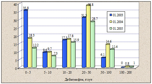Рис. 3.3. Распределение действующего фонда скважин Хохряковского месторождения по дебитам нефти за 2003–2004 гг.