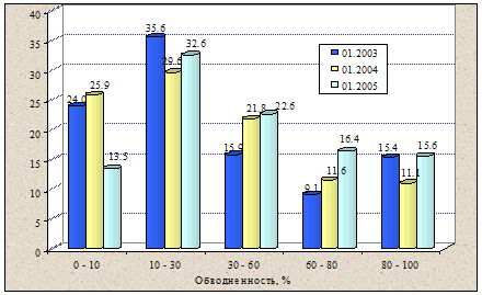 Рис. 3.4. Распределение действующего фонда скважин Хохряковского месторождения по обводненности за 2003–2004 гг.