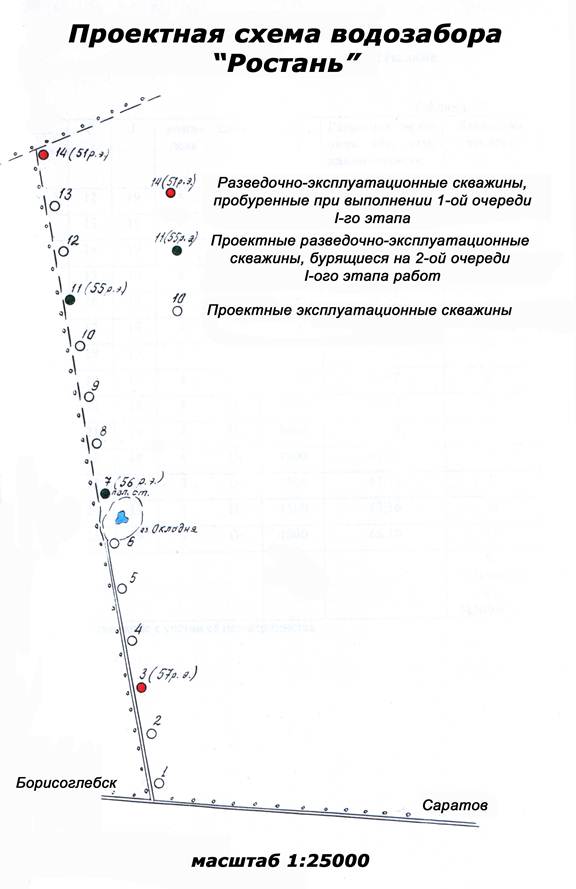 Как следует из схемы (на рис.2), проектный водозабор состоит из 14 скважин, располагающихся на расстоянии 300-400 м друг от друга. Общая протяженность ряда скважин проектируется в пределах 5 км с севера на юг (почти в меридианальном направлении). Суммарный дебит скважин составит порядка 44000 м3/сут.