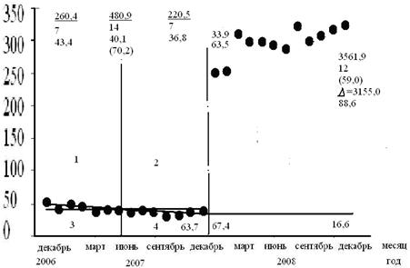 В координатах «месячная добыча нефти – календарное время» за нулевой отсчет времени принимаем месяц (11.2006) на 14 месяцев раньше месяца введения горизонтальных скважин из бурения (01.2008), т.е. в качестве ближней предыстории берем 14 месяцев. На график (рис. 8) наносим точки месячной добычи из указанной скважины по месяцам до и после ввода скважины в эксплуатацию. Проводим вертикальную прямую точку (01.2008), которая делит время на две части (до и после ввода скважины в эксплуатацию).