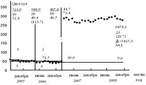 По количеству и положению точек после начала воздействия относительно горизонтальной базовой прямой наглядно выявляется качественный эффект (все 23 из 23 точек расположены выше базовой горизонтали) и его динамика. Для количественной оценки эффективности бурения горизонтальных скважин по эксплуатационным карточкам определяем суммарную добычу нефти после ввода скважин в эксплуатацию на дату анализа (с 1.02.2007 по 1.01.2009 гг.). Она оказалась равной 6454,2 т. Отсюда среднемесячная добыча нефти после воздействия оказалась равной 280,6 т, или на 530% больше базовой (44,7 т).