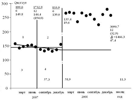 По количеству и положению точек после начала воздействия относительно горизонтальной базовой прямой наглядно выявляется качественный эффект (все 12 из 12 точек расположены выше базовой горизонтали) и его динамика. Для количественной оценки эффективности бурения горизонтальных скважин по эксплуатационным карточкам определяем суммарную добычу нефти после ввода скважин в эксплуатацию на дату анализа (с 1.01.2008 по 1.01.2009 гг.). Она оказалась равной 3090,7 т. Отсюда среднемесячная добыча нефти после воздействия оказалась равной 257,6 т, или на 90% больше базовой (135,4 т).