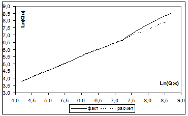 Рис. 21. Зависимость Ln(Qн) от Ln(Qж) для скважины №1