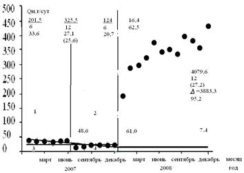 В координатах «месячная добыча нефти – календарное время» за нулевой отсчет времени принимаем месяц (01.2007) на 1 год раньше месяца введения горизонтальных скважин из бурения (01.2008), т.е. в качестве ближней предыстории берем 12 месяцев. На график (рис. 6) наносим точки месячной добычи из указанной скважины по месяцам до и после ввода скважины в эксплуатацию. Проводим вертикальную прямую точку (01.2008), которая делит время на две части (до и после ввода скважины в эксплуатацию).