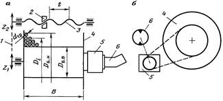 Рис. 16. Кинематическая схема барабана для наматывания колонны гибких труб и их укладчика при использовании планетарного редуктора (а) и цепной передачи (б): 1 – цепная передача привода механизма укладки КГТ (Z1, Z2 – число зубьев звездочек); 2 – каретка; 3 – ходовой винт; 4 – катушка; 5 – планетарный редуктор; 6 – гидравлический мотор. | ||