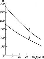 Рис. 19. Влияние внутреннего давления технологической жидкости на долговечность гибкой трубы: 1 – число циклов изгиба труб; 2 – число выполненных спусков-подъемов колонны |