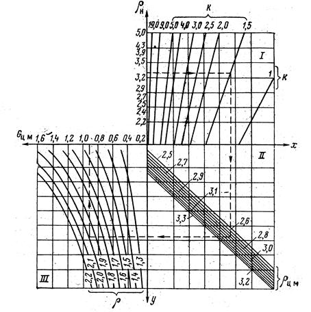 1) Для решения данной задачи воспользуемся номограммой, приведенной на рис. 2. В первом квадранте номограммы на оси ординат находим точку, соответствующую рн = 3,3 т/м3 и от нее проводим горизонталь до пересечения с прямой коэффициента К = 1,5. Из точки пересечения с лучом рцм = 2,8 т/м3. Затем перпендикулярно оси ординат проводим прямую до пересечения с кривой заданной плотности шлако-цементного раствора р = 2,0 т/м3, находящейся в третьем квадранте. Из полученной точки пересечения проводим вертикаль на шкалу значений Gцм и находим искомое значение Gцм =0,9 т/м3. необходимое количество наполнителя (песка) определяем по формуле: