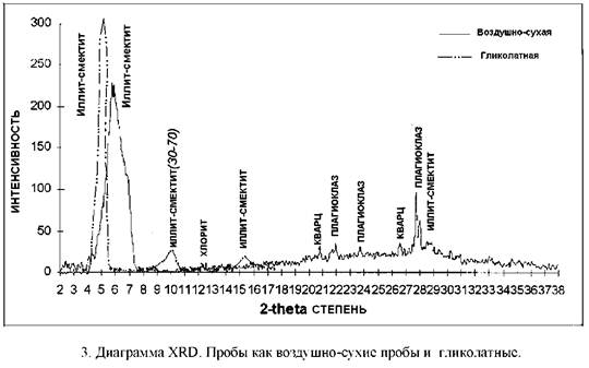 Методы препарирования, используемые для особых проб, зависят от целей. Не глинистые минералы обычно анализируются, как общий анализ порошков. Глины лучше изучать с использованием методики осаждения, которая концентрирует глинистые минералы и усиливает основные пики, хотя они подавляют пики с большими углами, которые важны для диагностики других минералов. В дополнении к стандартным воздушно-сухим анализам, пробы глин обычно испытываются после обработки этилен гликолем (рис 3), который расширяет межплоскостные пространства решётки любой разбухающей глины, которая присутствует в образце (т.н. смектит).