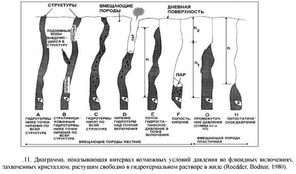 В порфировых структурах коррекция меньшая, обычно около 50°С. В эпитермальных жилах требуется максимальная коррекция около 10°С. В этом случае, получаемые данные находятся в пределах точности других допущений и в связи с этим обычно поправками пренебрегают. Но это необходимо иметь в виду. Этот факт является одной из причин, почему корреляция между температурой флюидных включений и минералогией не всегда соблюдается даже в эпитермальных жилах (и это также имеет значение для определения минералов-геотермометров на основании термометрии по флюидным включениям). Этот аспект должен рассматриваться при исследовании жильных текстур, которые могут свидетельствовать о фазовом состоянии гидротем. Если это так, то, по-видимому, давление, при котором происходило образование минералов, будет меньше гидростатического давления, и коррекция давления будет небольшой, создавая большую уверенность в полученных результатах.