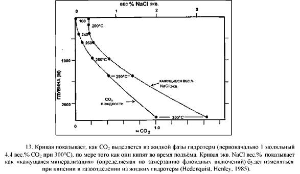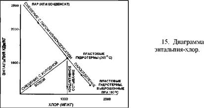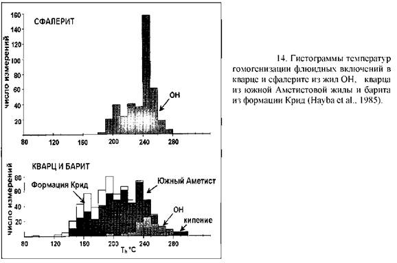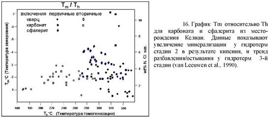 Для изображения. Если имеется значительное количество измерений, то полезны гистограммы (рис 14). Идеальным считается нанесение результатов на графики энтальпия-минерализация, поскольку смешение, кипение и остывание взаимосвязаны на графике в виде прямых линий (рис 15). Это обычно не делается, если данных недостаточно. График точек гомогенизации/замерзания является приближением к этому, а не плохим первым шагом (рис 16), но трудно знать, что делать с точками, где нет измерений минерализации. Если данные получены из проб, отобранных из значительно большего вертикального интервала (из скважины), то полезно построить графики с наложением вертикального масштаба на кривые точек кипения-глубина.
