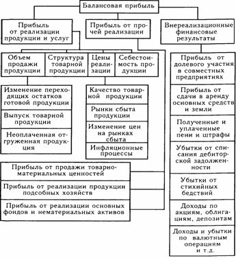 Балансовая прибыль состоит из прибыли от реализации продукции (выручка от реализации продукции без косвенных налогов минус затраты на производство и реализацию продукции) плюс внереализационные доходы (доходы по ценным бумагам, от долевого участия в деятельности других предприятий, от сдачи имущества в аренду и т.п.) минус внереализационные расходы (затраты на производство, не давшее продукции, на содержание законсервированных производственных мощностей, убытки от списания долгов и т.д.). Учитывается также и прибыль от прочей реализации.