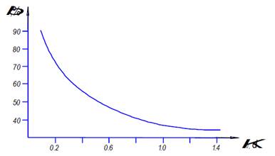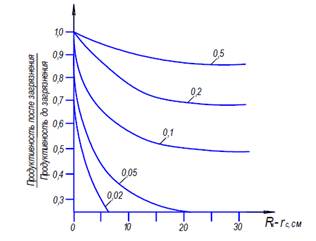 Рисунок - 2 Снижение продуктивности скважин от глубины загрязнения.