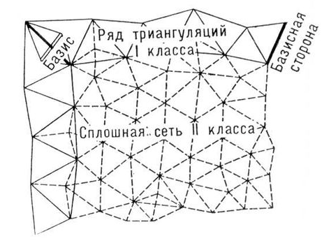 Состоит в построении рядов или сетей примыкающих друг к другу треугольников и в определении положения их вершин в избранной системе координат. В каждом треугольнике измеряют все три угла, а одну из его сторон определяют из вычислений путём последовательного решения предыдущих треугольников, начиная от того из них, в котором одна из его сторон получена из измерений. Если сторона треугольника получена из непосредственных измерений, то она называется базисной стороной триангуляции. В рядах или сетях триангуляции для контроля и повышения их точности измеряют большее число базисов или базисных сторон, чем это минимально необходимо.
