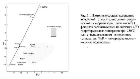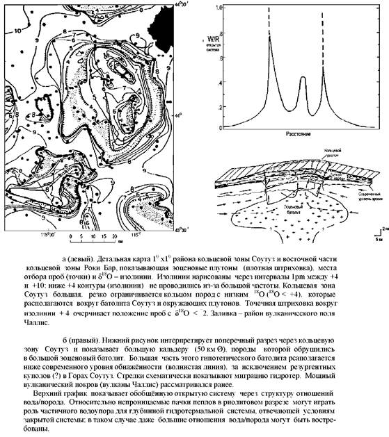 Рисунок б показывает высокие отношения вода-порода, рассчитанные для этой проницаемой зоны кольцевых разломов; распределение изотопов на этой площади отражает наличие латерального потока метеорных гидротерм, длиной 25-50 км, который проникает на глубину 7 км. Эта гигантская метеорная конвективная ячейка сопоставима по размерам с ячейкой, существовавшей около Скаергардской интрузии.