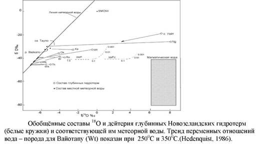 Рисунок показывает, что большинство низкосернистых геотермальных систем в мире имеют преимущественно циркуляцию метеорных вод. Наоборот магматические флюиды сильно отличаются по изотопному составу от метеорных гидрогеологических систем. Это будет обсуждаться более детально при изучении минерализации высокосернистых систем.