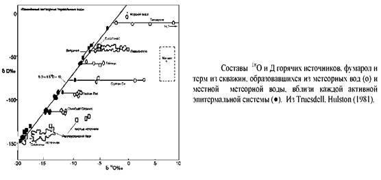 Гидротермы, ответственные за низкосерную эпитермальную минерализацию, преимущественно метеорные, несмотря на то, что предполагаемым источником тепла, генерирующим гидротермальную конвекцию, в большинстве случаев является магма. Этот вывод основывается, главным образом, на содержаниях кислорода - 18 и дейтерия в эпитермальных флюидах. Значения 5Д1 обычно определяется прямым анализом флюидных включений, тогда как 518О определяется по анализам кристаллов кварца и кальцита, предполагая, что один из них имеет независимый геотермометр. Изотопный состав флюидов некоторых эпитермальных месторождений, рассчитанный по изотопному составу гидротермальных минералов, был использован С Neil, Silberman и показан на рис. Для сравнения, изотопный состав гидротерм и местной метеорной воды некоторых Новозеландских геотермальных систем показан на рис.