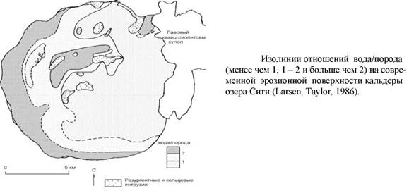 Larsen и Taylor провели детальные кислородно-изотопные исследования на меньшей кальдере оз. Сити в западной части гор Сан Хуан, Колорадо. Рисунок 3.6 показывает границы кальдеры и карту изолиний 518О пород по 300 образцам в районе оз. Сити. Сильные отрицательные аномалии связаны с западной границей кальдеры; однако, это частично относится к тому факту, что западная граница эродирована на 1000 м глубже, чем восточная часть.