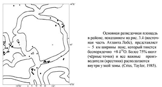 Рисунок показывает 5 км ширины полосу, охватывающую изолинию +8 %% 518О, которая оконтуривает большинство эпитермальных и мезотермальных шахт благородных металлов в этом районе. Минерализация в этом случае не связана с районом наиболее низких 518О и фронтом гидротерм. Скорее всего этот район располагается вне кальдерно кольцевой зоны разломов, где имелся небольшой градиент в отношении вода / порода, который наилучшим образом способствовал минерализации.