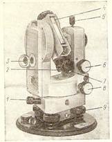 1 – наводящий винт горизонтального круга; 2 – окуляр микроскопа; 3 – зеркало; 4 – цилиндрический уровень на зрительной трубе; 5 – закрепительный винт зрительной трубы; 6 – наводящий винт зрительной трубы; 7 – окуляр зрительной трубы; 8 – наводящий винт алидады; 9 – подъемный винт.