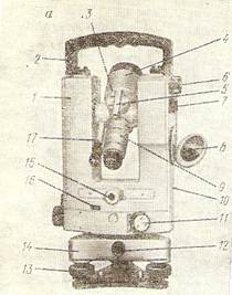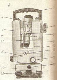 3 – 2Т5; 4 – 2Т5К. 1 – колонка; 2 – ручка; 3 – клиновое кольцо; 4 – зрительная труба; 5 – коллиматорный визир; 6 – призма луча; 7 – окно; 8 – зеркало; 9 – кремальера; 10 – боковая крышка; 11 – рукоятка перевода горизонтального круга; 12 – закрепительный винт подставки; 13 – подъемный винт; 14 – подставка; 15 – окуляр; 16 – иллюминатор круга искателя; 17 – микроскоп; 18 – юстировочный винт для приведения МО к нулю.