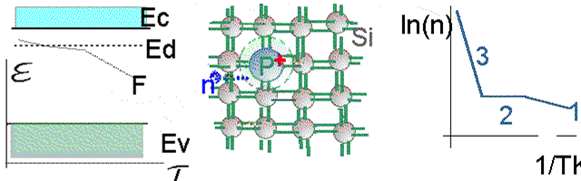 При ионизации донорного атома, он отдает электрон в зону проводимости и заряжается положительно. При низких температурах большая часть донорной примеси не ионизована и уровень Ферми расположен между дном зоны проводимости и донорным уровнем. При повышении температуры число электронов, переходящих с донорного уровня в зону проводимости возрастает, соответственно возрастает и концентрация свободных электронов (область 1 на правой верхней диаграмме). При этом уровень Ферми приближается к донорному уровню (левая диаграмма). При некоторой температуре вся примесь оказывается ионизованной и концентрация электронов (возникших за счет ионизации доноров), перестает изменяться (область 2 на диаграмме). Это область истощения донорной примеси (уровень Ферми в этой области ниже донорного уровня). При дальнейшем увеличении температуры, наступает момент, когда концентрация электронов, возникающих при их возбуждении из валентной зоны в зону проводимости становится больше концентрации донорной примеси и зависимость концентрации электронов от температуры принимает такой же вид, что и в собственном полупроводнике (участок 3), при этом уровень Ферми находится вблизи середины запрещенной зоны.