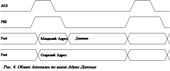 Основу процессорной части прибора составляет микроконтроллер AT89C51 (D1). Шина данных микропроцессора 8и битная, коммутируемая т.е. адрес и данные передаются по одной шине. Для выделения младшего байта адреса используется регистр D2. Программа работы прибора храниться в ПЗУ программ D5. Регистр D2 фиксирует состояние шины адрес-данные по переходу сигнала ALE из высокого в низкий логический уровень. Считывание из ПЗУ слова программы происходит по переходу сигнала PSEN из высокого в низкий логический уровень. Отсутствие конфликтов на шине обеспечивается задержкой сигнала PSEN по отношению к сигналу ALE. Обмен с ОЗУ D6 происходит полностью аналогично, но чтение происходит не по сигналу PSEN, а по сигналу RD. Обмен с ОЗУ и ПЗУ происходит только тогда, когда сигнал А15 находиться в низком уровне. Схематично процесс обмена показан на рис 4.
