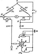 В инклинометре установлен электромагнит, который по команде с поверхности фиксирует или освобождает магнитную стрелку и отвес. С помощью коллектора с тремя контактными кольцами 9 и двумя парами щеток 10 к измерительной цепи подключаются с помощью переключателя П (рис. 5) либо реохорд угла наклона, либо датчик азимута.
