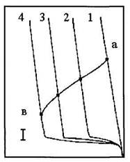Рис.2.5 Схематические термограммы а-в, обусловленные «временным эффектом записи» при повышении и снижении температуры в стволе скважины.