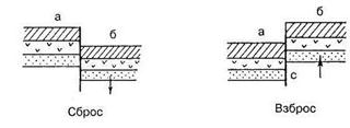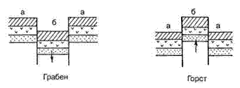 Разрывные дислокации образуются в результате интенсивных тектонических движений, сопровождающиеся разрывом сплошности пород и смещением слоев относительно друг друга. Амплитуда смещения может быть от нескольких сантиметров до километров при ширине трещин до нескольких метров. К разрывным дислокациям относятся сбросы, взбросы, грабены, горсты, сдвиги и надвиги (рис. 3: а – неподвижная часть земной коры, б – подвижная часть).