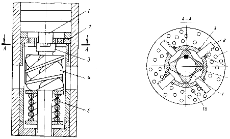 Измельчающее устройство монтируется в приемной части насоса и состоит из шнека 4, пружины 5, неподвижного диска 2, кулачка 9, кольца 3, ножей 6. При вращении вала насоса 1 кулачок 9 упирается в пружину 10 и приводит во вращение кольцо с ножами 6 (рис.3.10).Ножи измельчают сравнительно нетвердые включения, например, кусочки парафина, смолистых отложений, а также волокнистые образования. Размельчение этих примесей происходит за один оборот вала. Если же в потоке жидкости встречается не поддающееся размельчению твердое тело, вращение ножей прекращается из-за упора одного из них в это твердое тело.