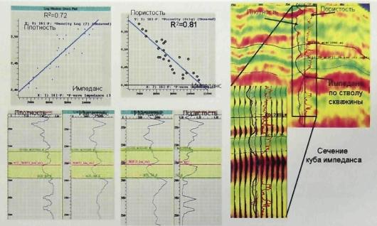 Рис . 10. Анализ связи синтезированного из куба импеданса с прогнозными по ГИС кривыми пористости и плотности