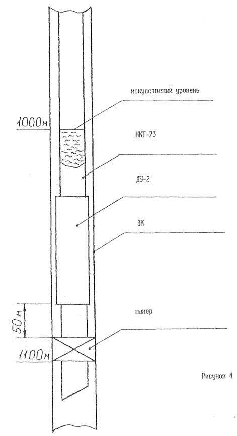 В процессе ремонтных работ на скважине после изоляции обводнившихся горизонтов и ликвидации негерметичпостей необходимо проверить цементный мост и вксплутащгакнуго колонну па герметичность понижением уровня в скважинй, для чего необходимо заказать СВабируГОщуга установку, произвести отбор жидкости с необходимой глубины и проследить за уровнем. Для решения поставленной задачи Предлагается вместо заказа свабиругощеи установки использовать компановку с ДУ (рис.4). Пакёр с ДУ спускается на глубину 1100 м при понижении уровня па 1000 м. Внутренняя полость НКТ заполняется промывочной жидкостью из расчета получения уровня 1000 м, сажается пакер и производится его опрессовка, После открытия ДУ прослеживается уровень, который не должен подняться выше расчетного по отношению к внутренним объемам эксплутационной колонны и НКТ.