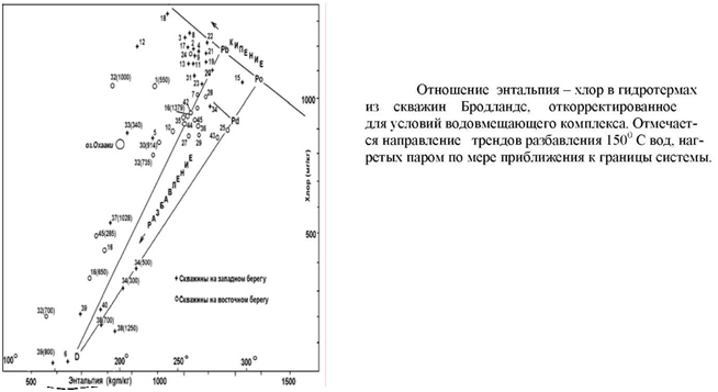 При исследовании современных эпитермальных систем, график хлор-энтальпия часто используется для определения изменений химический состава гидротерм в результате кипения и разбавления. Это приводит к выводу о применимости его к палеоэпитермальным системам с использованием данных по включениям в минералах, когда известна возможность влияния газов на оценку Тгп. Для иллюстрации рассмотрим гидротермальные процессы в геотермальной системе Бродлэндс в Н. Зеландии
