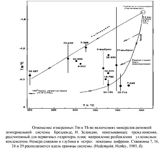 Для месторождения Бродландс имеются данные по содержанию NaCl и ОО2 и прямые измерения температур глубинных не кипевших первичных гидротерм. Здесь присутствуют относительно разбавленные хлоридные гидротермы, обогащённые углекислым конденсатом, с Т 150-2000С на границе и над глубинными хлоридными гидротермами. Но даже без этой новой информации по включениям в минералах можно установить, что некоторые относительно холодные, но с низкими Tm гидротермы, были образованы путём разбавления. Относительно горячие гидротермы с более высоким Tm свидетельствуют о кипении и газоотделении. Большие вариации Tm при небольших изменениях Th в некоторых образцах также позволяют предполагать циклические периоды кипения и газоотделения в результате изменения газовых концентраций.