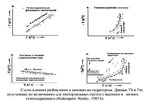 Минерализация гидротерм легко определяется в современных системах. Её труднее определить для палеосистем, где информацию несут только включения в минералах. В палеосистемах большие изменения температуры замерзания могут быть вызваны кипением и газоотделением, как показано на кривой 2, рис. 4 b. Штриховая кривая показывает полное газоотделение при 2500С, так что увеличение эквивалента вес.% NaCl отражает концентрацию NaCl в остаточной жидкости в результате парогазоотделения во время кипения.