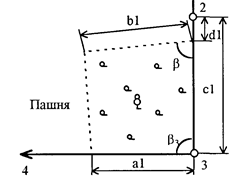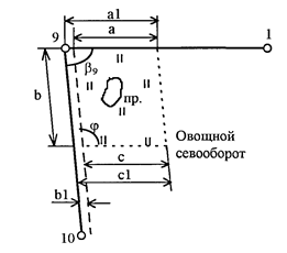 2.1.2 В соответствии с рисунком 2, по результатам измерений в натуре (приложение Б), вычислить площадь сенокоса с прудом и площадь проектируемой дороги в овощном севообороте.