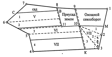 В нижней части землепользования, согласно эскизному проекту, запроектировать графическим способом три поля полевого севооборота и две полевые дороги: от точки 10 до линии 3-4 и вдоль линии 8-11.