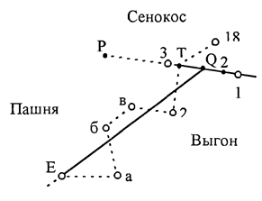 1.1. Спрямить ломаную часть восточной границы поля VI с расчётом сохранения площадей пашни и выгона. Для этого из точки Е в соответствии с рисунком 14 опустить перпендикуляр на линию PQ и площадь фигуры EFaE определить планиметром. Вычислить основание FQ равновеликого треугольника EFQ и отложить его, чтобы получить положение точки Q на плане FQ = 2PEFaE / EF. Длину EF измерить на плане.