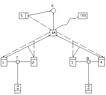 На первом этапе цементирования насосы агрегатов 1 и 4 нагнетают воду в смесительные машины 7 и 8, куда одновременно поступает сухая смесь цемента из бункеров. Из смесителя тампонажный раствор поступает в напорный коллектор блока манифольдов (БМ), а потом и в цементировочную головку 6. Сразу же после закачки расчетного объема тампонажного раствора в эксплуатационную колонну краны на нижних боковых отводах цементировочной головки закрывают, а через верхний боковой отвод агрегатом 5 закачивают продавочную жидкость.