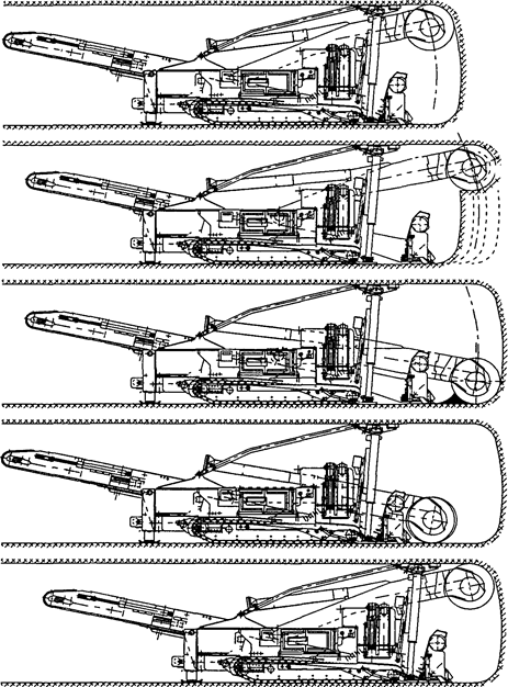 Шаг 3 - В то время как начинается процесс бурения (анкерования). Режущий орган начинает перемещаться за счет своей телескопической рамы вперед, максимум на 1 м Одновременно начинает перемещаться вперед и погрузочный стол и транспортер, за счет чего обеспечивается своевременная погрузка и транспортировка горной массы. Во время этого процесса погрузочные механизмы и транспортер должны находиться в действии.