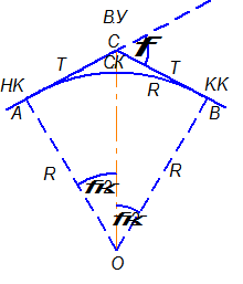 Дуга окружности от начала до конца закругления называется кривой – К и определяется по формуле: