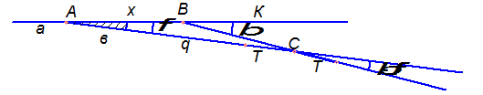 Примыкание пути осуществляется при помощи стрелочных переводов, которые устанавливаются на прямых участках пути. Пересечение осей двух соединяющихся путей называется центром стрелочного перевода (ЦСП). Расстояние а от ЦСП до начала стрелки и в до конца крестовины, стандартны для стрелочного перевода каждого перевода. Для разбивки примыкания трассируемого пути CL к существующему АК находим точку пересечения осей путей В и измеряем угол примыкания β. Так как стрелочный перевод отклоняет путь на постоянный угол α, то, чтобы соединить пути CL и ВК, необходимо разместить ЦСП не в вершине угла примыкания В, а в некоторой точке А. Расстояние АВ=х может быть найдено из решения треугольника АВС, в котором известны все три угла: