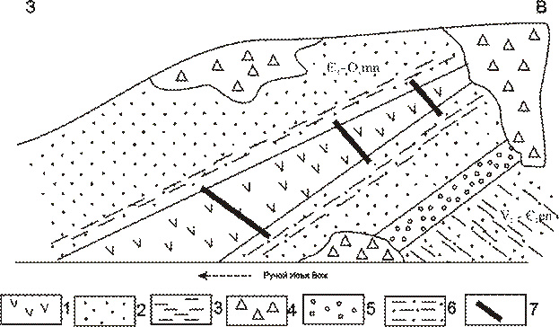 Рис. 2.1.1 Схематический геологический разрез основания манитанырдской серии. Условные обозначения:1 – базальтоиды; 2 – песчаники; 3 – алевролиты; 4 – аргиллиты; 5 – конгломераты; 6 – делювиальные развалы; 7 – линии разрезов.